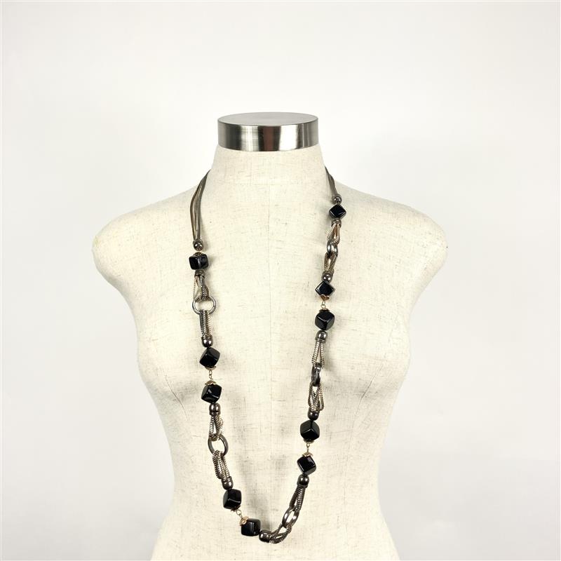 Black Mixed Metal Chrome Beaded Long Necklace